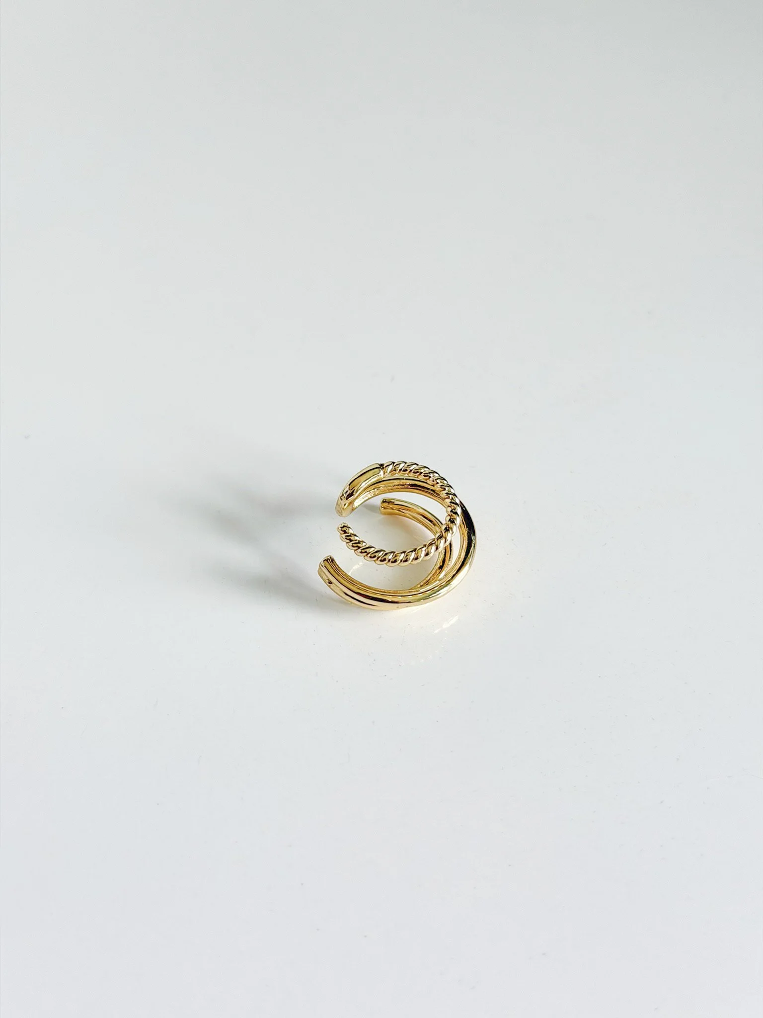 Instantly create a multi-piercing, cascading look with this dramatic gold-plated ear cuff. Designed to hug the cartilage comfortably, this cuff features three delicate chains of varying lengths that drop down elegantly, creating beautiful movement and sparkle. Each chain is tipped with a unique, micro-pavé-set Cubic Zirconia charm: a geometric square, a sleek spike, and a petite teardrop. This piece is perfect for making an effortless, edgy statement.